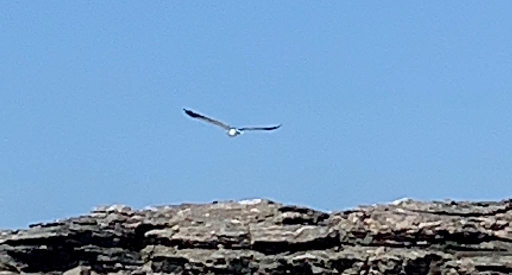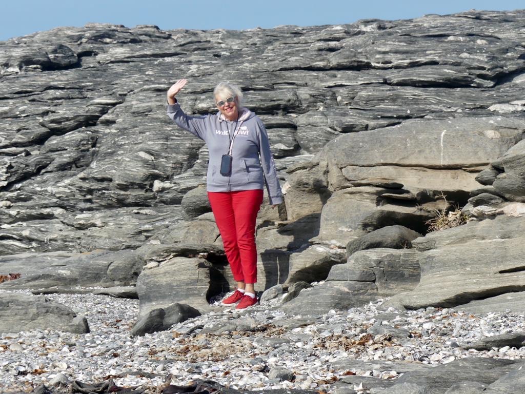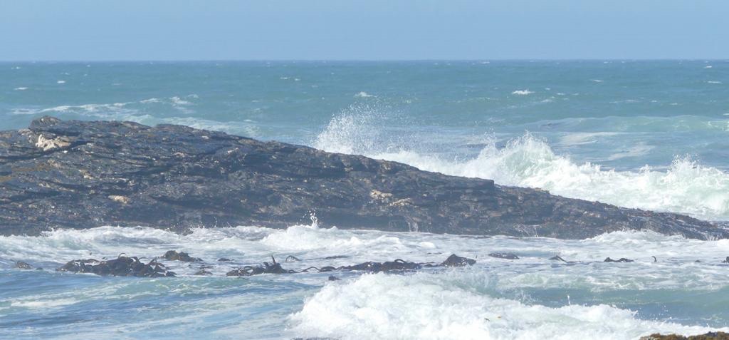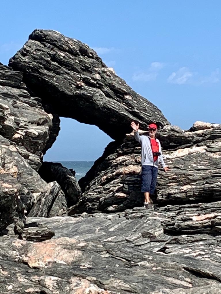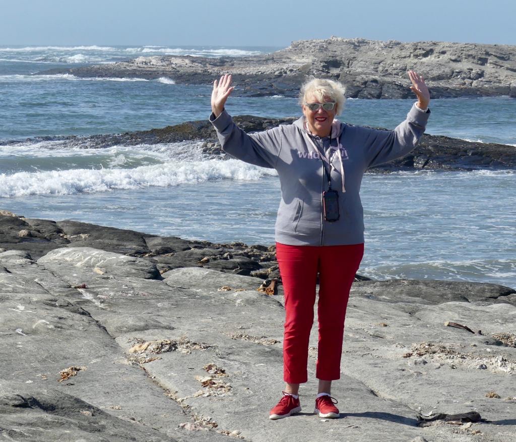 Wir waren am kleinen Bogenfels. Der große ist 100 km entfernt. Das war zu weit. Am kleinen Bogenfels haben sich die Leute von Lüderitz einen Grillplatz gebaut und wie man sieht auch in Deutsch beschriftet. Helmut hat an der Stelle Spuren von der braunen Hyäne und vom Schakal gefunden. Aber die haben sich versteckt. Wir haben die nicht gesehen. Der Schakal tötet die Robben Babys. Das regelt die Natur so, denn die Robben werden jedes Jahr mehr und fressen die Fische weg. Dann ist nicht genug Fisch da und Helmut sagt, die Fischer fangen weniger und die Fische werden kleiner. Haben gar keine Chance mehr groß zu werden. Außerdem kommen die Delphine und Wale nicht mehr, wenn es nicht genug gibt. Die Wale kommen meistens im November und bringen hier ihre Jungen zur Welt. Eigentlich müssten sie um diese Zeit noch da sein. Wir haben weder Delphine noch Wale gesehen. Dafür jede Menge Pinguine und Robben.